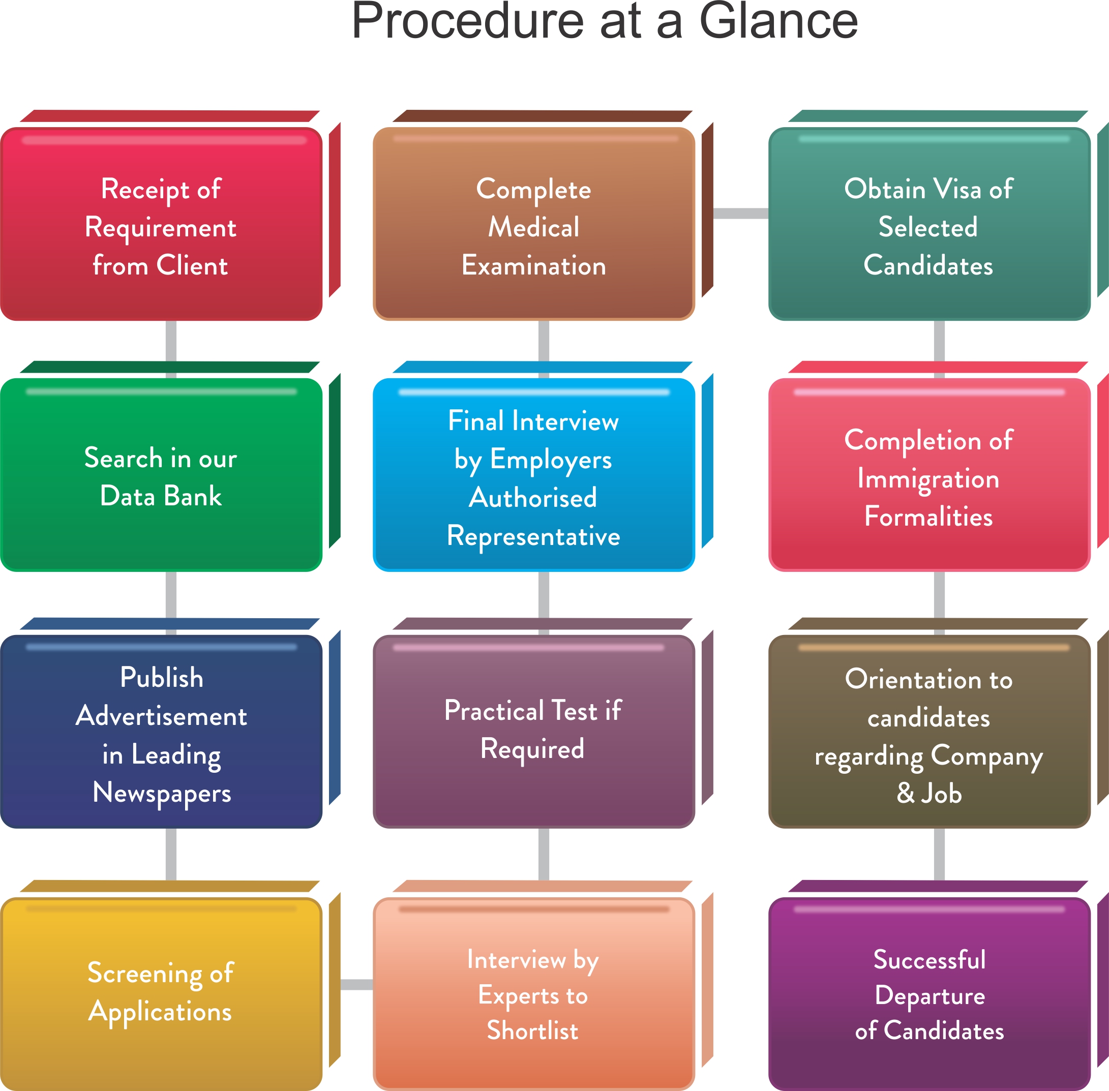 We always prefer selection of applicant either by oral or practical test to be conducted by the employer or his authorized representative. We arrange candidates accommodation, transport and all other logistic support required for the purpose. In case we are entrusted with the selection & testing of worker, we normally do it with the help of a team of experts for technical & professional categories under direct supervision of our professional executives.